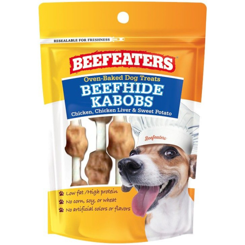 Beefeaters Oven Baked Beefhide Kabobs is a unique, chewy treat has four distinct flavors including real chicken breast, chicken liver & sweet potato (super food) on pure beefhide twist. This chew contains real chicken as the first ingredient and grain free with no artificial flavors or colors. Give your furry friend the taste they crave.
