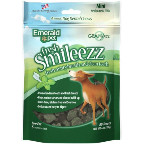 Emerald Pet Fresh Smileezz Dental Dog Treats Mini - 6 ozEmerald Pet Fresh Smileezz all-natural dog dental chews are designed to provide optimal oral health using a wide shape to clean the entire surface of the tooth and massage the surrounding gum line. The premium grain-free formula includes real parsley, dill, and mint to eliminate odor-causing bacteria for fresh breath you can really smell. No artificial ingredients, colors, or preservatives. Naturally preserved and proudly Made in the USA using US ingredients.