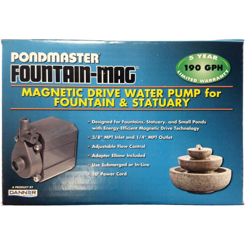Pondmaster fountain mag water pumps are designed for fountain or statuary installations, and have been the most trusted pumps in the industry for over 20 years. Each Fountain-Mag pump provides quiet, efficient and reliable performance, 24/7. Ideal for any small pond, statuary or fountain application, Fountain-Mag Pumps operate equally well submerged. The Fountain-Mag 190 GPH pump is the only pump in the collection that can be used submerged or in-line. With a ceramic impeller as its only moving part and an epoxy-encased power unit, you never have to worry that the pump will contaminate your water with harmful chemicals or oils. The Foutain-Mag 190 comes with a 10-foot power cord and a 5-year manufacturer limited warranty. The fountain mag 35, 65, 80, and 140 come with a 6-foot power cord and a 1-year limited warranty.